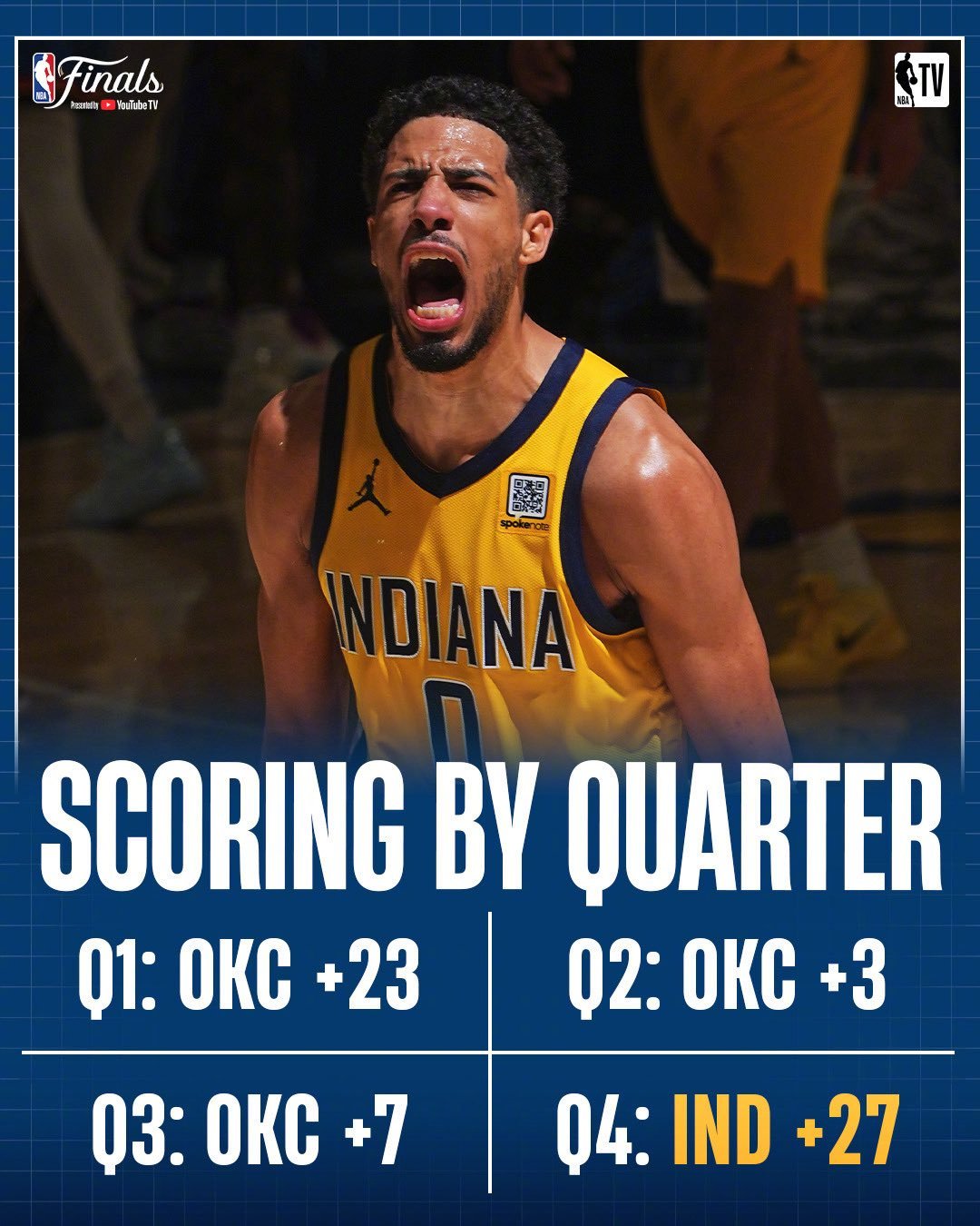 本场比赛开始前,NBA公布了几项有趣的数据统计,为比赛增添了悬念:总决赛至今,步行者队在第四节净胜雷霆27分;自2020年以来,雷霆队已经在系列赛G4中取得7连胜。