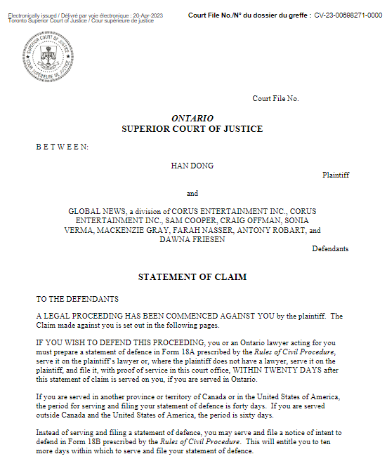 2023年4月20日 ,董晗鹏向Global News、Corus Entertainment Inc.、Sam Cooper、Sonia Verma 等发出起诉书,要求1500万加元的诽谤赔偿。起诉书称被告在2023年2月和2023年3⽉发表了针对董先生的恶意、虚假和诽谤性文章和报道,破坏了他来之不易的声誉和事业,并使他和他的家人面临仇恨言论和威胁。