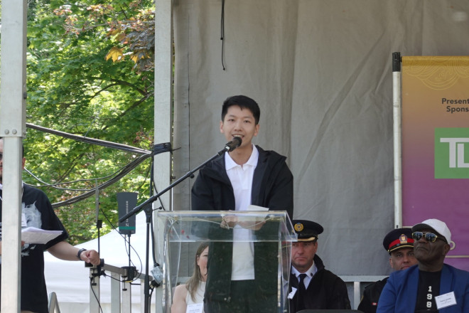 香港驻多伦多经济贸易办事处署理处长杨江锋于六月十四日在加拿大多伦多中央岛举行的第37届多伦多国际龙舟节开幕礼上致辞。
