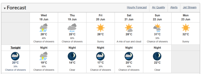 根据预报,周三下午有40%的降雨概率,并且有雷暴风险。周三晚上,降雨的概率将增加到60%,气温最低为18°C。