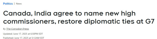 周二,加拿大总理马克·卡尼(Mark Carney)与印度总理纳伦德拉·莫迪(Narendra Modi)在阿尔伯塔G7峰会期间举行会晤,加拿大与印度达成协议,将互派新的高级专员,并恢复为两国公民提供的常规外交服务。
