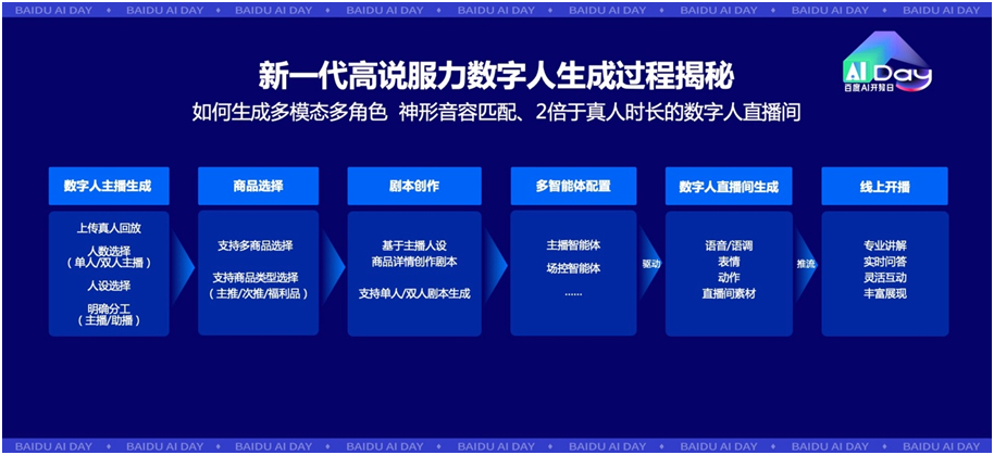 她介绍道,剧本生成技术包含台词生成、多模驱动和动态交互三部分。以罗永浩数字人剧本为例,基于文心大模型4.5 Turbo生成的剧本,充分展现了主播的个人特色,具备典型的罗氏幽默风格,并能够实现双人主播的内容协同,动态实现丰富的实时互动。通过文本自控的语音合成大模型,实现高复原的语音合成能力,再结合直播台词及发音人特征,合成风格恰当、自然流畅的声音。为解决罗永浩数字人直播双人声音配合的难点,百度采用对话上下文编码器,将对话历史输入和当前对话进行语音合成的统一推理计算,最终实现流畅、自然的双人对话效果。在数字人形象生成以及驱动方面,通过结合多模态视频理解、跨模态信号生成、视频生成等技术,克服了高可控交互,高精度、长时间一致性保持等难点,实现了高一致性超拟真罗永浩数字人长视频生成。