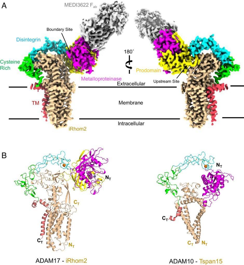 团队通过先进的冷冻电子显微镜,给蛋白分子拍摄“高清写真”,首次清晰捕捉到这两个蛋白及其相互作用的原子级结构细节,并确定了对ADAM17的活性和调节至关重要的关键结构元件。