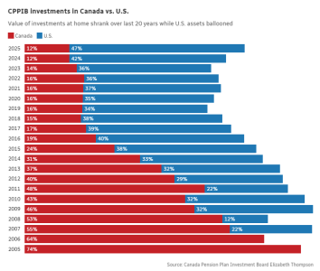 綜合報導,幾周前,加拿大養老金計劃投資委員會(Canada Pension Plan Investment Board, CPPIB)披露,加拿大養老金計劃(CPP)僅12%的資產投資於加拿大——這是有史以來的最低水平。而其7140億加元的基金中,最大份額(47%)目前投向美國——創下歷史最高比例。