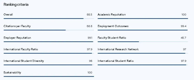 多伦多在QS排名的10项指标中,有8项的得分在97分以上,但有两项拖后腿。一项是论文引用量,得分68.8分,另一项是师生比例,得分仅45.7分。