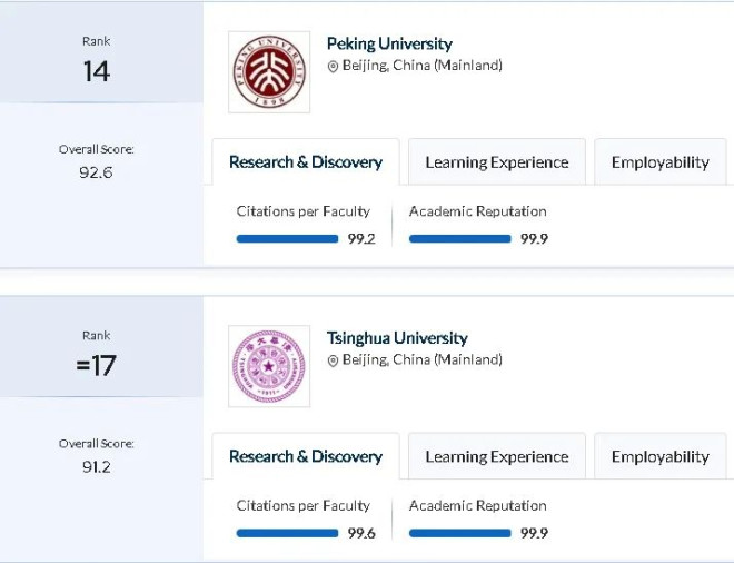 中国的北大和清华两所名校跻身全球前20之列。北大排在第14位,清华第17位。进入前100位的中国大学还有:复旦大学(第30名),上海交大(第47名),浙江大学(第49名)。