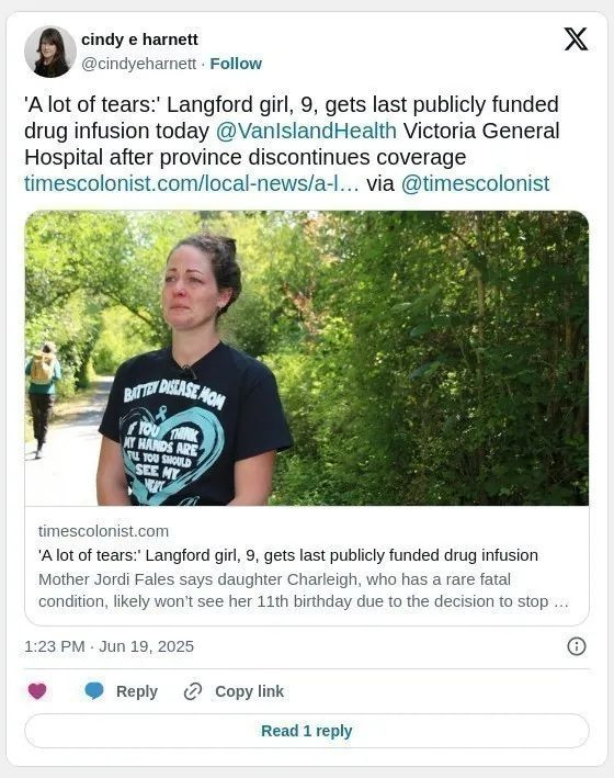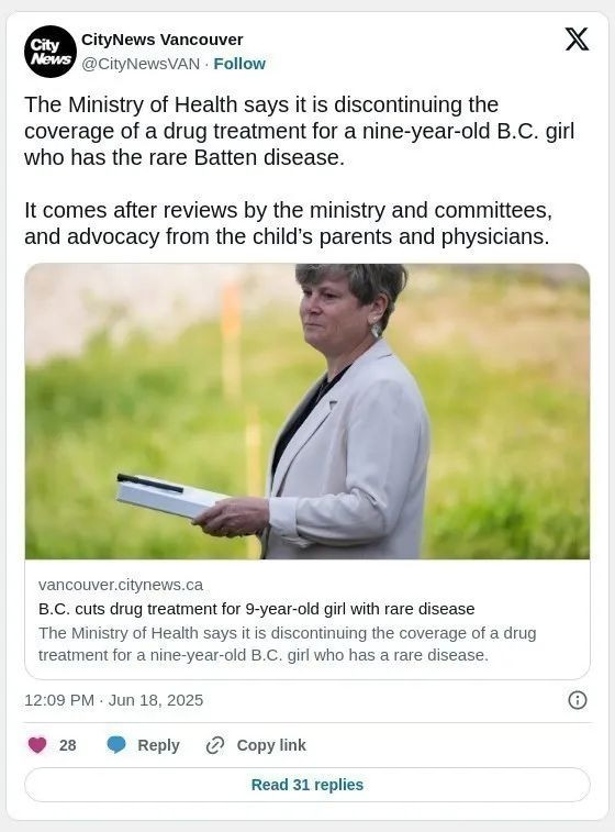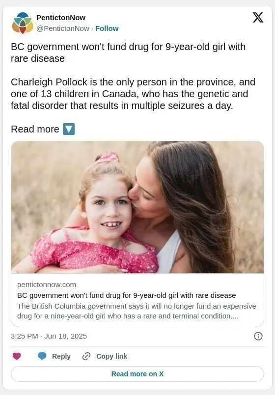 自2019年起资助每年费用高达100万的高价药物后,BC省政府于本周三宣布,将停止为温哥华岛一名患有罕见绝症的小女孩提供该药物的公共资助。