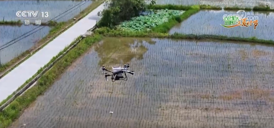 在另一块稻田里,植保无人机正在对刚插好的稻苗喷洒肥料。农场负责人表示,单季稻插秧后3—7天,就需要根据稻苗返青和分蘖的情况施肥,以促进它的生长。用无人机施肥可精准控制用量,一天能管200多亩,同时,还能节省30%的肥料。