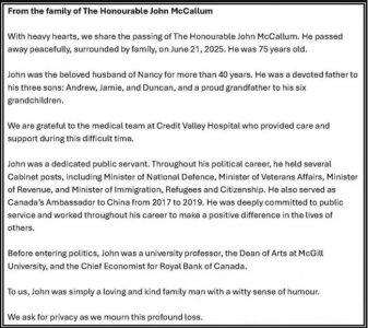 據麥家廉家人周日下午在臉書上發布的一份聲明,這位前自由黨內閣部長、安省國會議員已經去世。