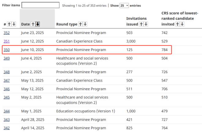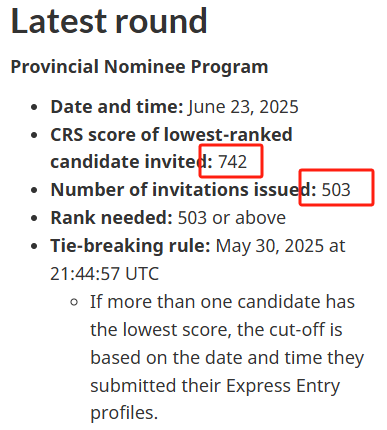 6月23日,加拿大政府官网公布了快速通道(Express Entry)的最新一轮邀请,类别为省提名项目,共有503人获邀,最低分数为742分。该分数线是在5月30日晚上9点44分57秒截取。