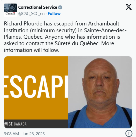 联邦惩教署称,已联系魁省省警,后者已对Plourde发出逮捕令。