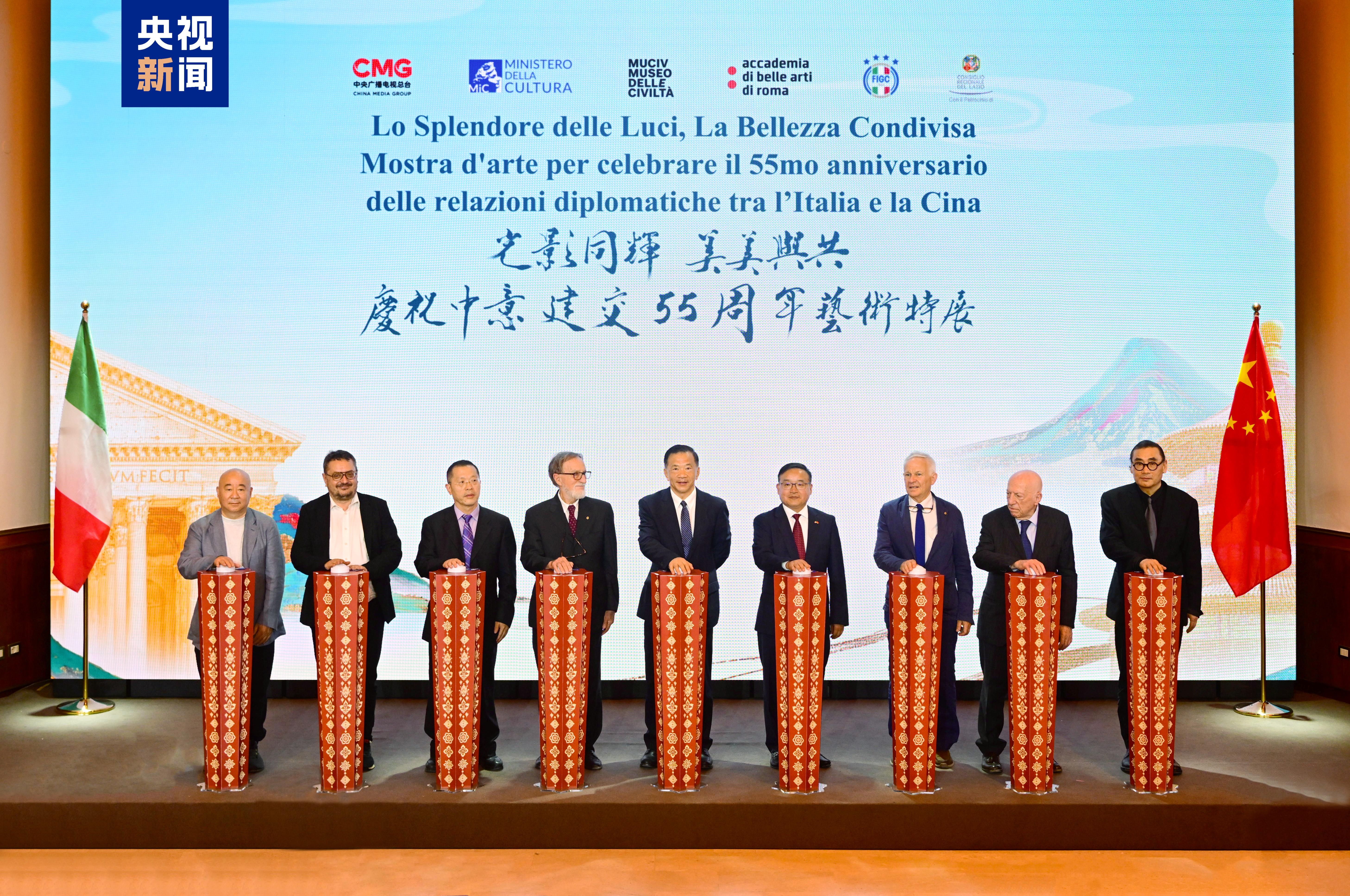 当地时间6月25日,由中国中央广播电视总台联合意大利文化部、意大利人类文明博物馆、意大利罗马美术学院、意大利足球协会、意大利拉齐奥大区议会主办的“光影同辉 美美与共”——庆祝中意建交55周年艺术特展在意大利林琴国家科学院盛大开幕。