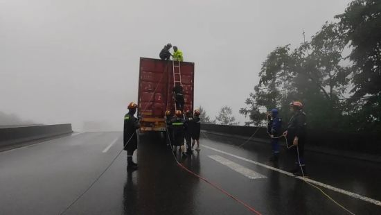 贵州蓝天救援队队长王毅向中国新闻周刊介绍,今日凌晨4时救援队接到当地应急协调函,随即,他们动员了47人分别从各地增援榕江。在三都县排洞停车区约100米位置,他们遇到悬挂在断桥上的赣C牌照挂车。7时10分左右,蓝天救援队几支队伍汇合在断桥处,利用携带的绳索、绳索梯等实施救援,于8时30分将悬挂车头内的司机成功救出。