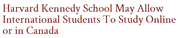 据哈佛深红 (The Harvard Crimson)6月25日报道,哈佛大学肯尼迪政府学院(Harvard Kennedy School)周二宣布,如果国际留学生在下一个学年无法进入美国,该学院可能允许他们在线学习或在多伦多大学完成学业。