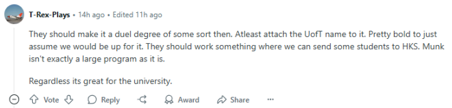 有人觉得应该搞成双学位项目:“他们应该把这个项目变成某种形式的双学位,至少也要把多伦多大学的名字挂上去。就这么直接假设我们会愿意接受,未免太大胆了。他们应该想个办法,让我们也能派一些学生去肯尼迪学院。毕竟芒克学院本身就不是一个很大的项目。不过无论如何,这对我们学校来说是件好事。”