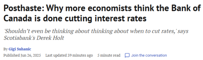 加拿大皇家银行(RBC)经济研究团队也重申了此前的判断:加拿大央行已经完成本轮降息周期。