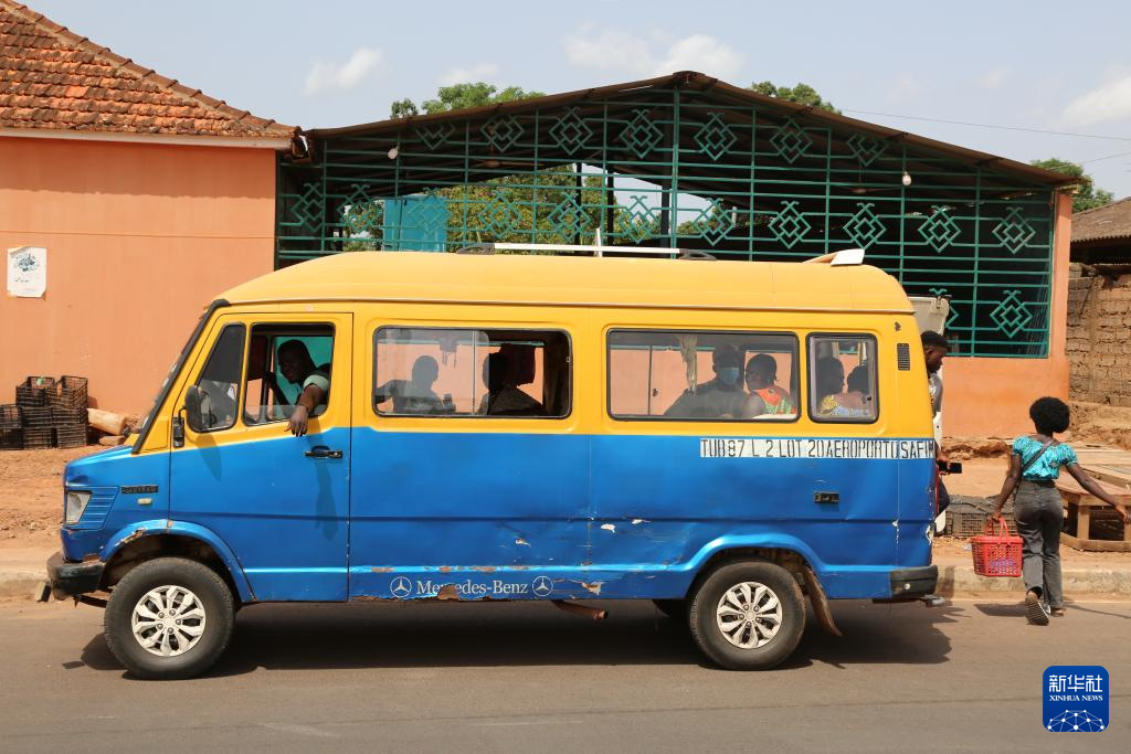 6月15日,在几内亚比绍比翁博省萨芬区,一辆客运巴士停在中国援建的萨芬公路路边。新华社记者 张健 摄