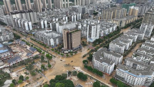 頂圖圖說:6月27日,航拍洪災後的貴州榕江縣城。