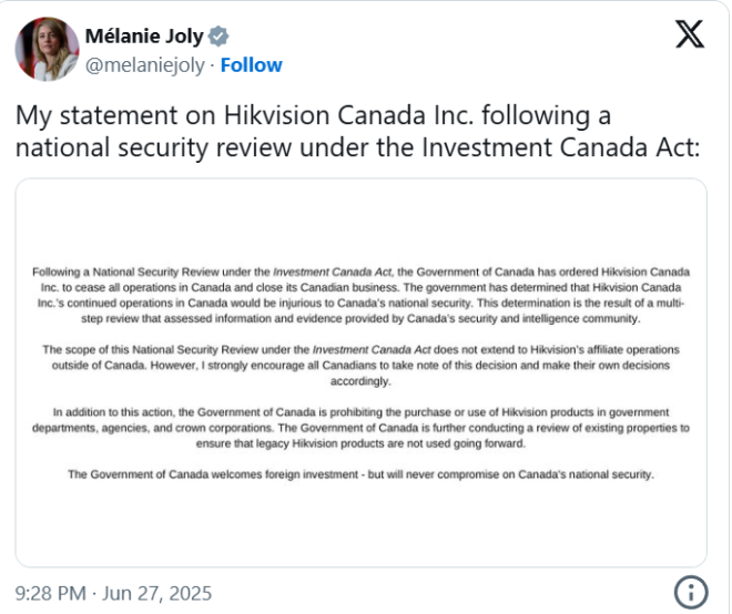 Joly 在 X上表示:“政府已认定海康威视加拿大公司在加拿大继续运营将损害加拿大的国家安全。”她补充说,这一决定是在对加拿大安全和情报机构提供的信息进行多步骤审查后做出的。