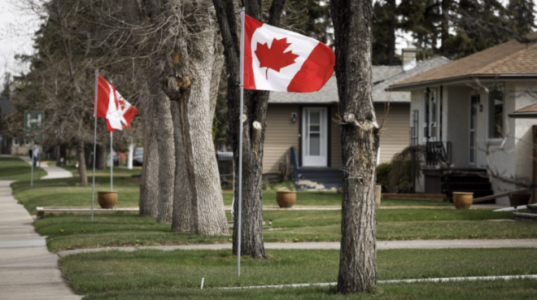 在加拿大阿省南部一個小鎮,一排排加拿大國旗在高高的旗杆上高高飄揚,覆蓋着修剪整齊的草坪。這裡也是阿省省長、她丈夫和他們家愛犬的家。