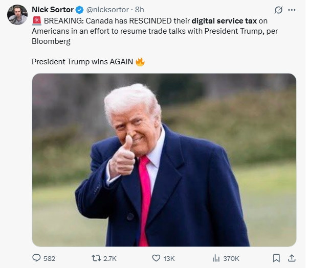 特朗普6月27日早些时候在社交媒体“真相社交”上发文说:“我们刚刚获悉,加拿大——一个非常难以与之开展贸易的国家,多年来,他们对我国农民征收高达400%的乳制品关税——刚刚宣布将对我们美国科技公司征收数字服务税,这是对我们国家的直接而赤裸裸的攻击。他们显然是在效仿欧盟,欧盟也采取了同样的做法,目前也在与我们进行磋商。鉴于这项令人震惊的税收,我们特此终止与加拿大的所有贸易谈判,立即生效。我们将在未来七天内告知加拿大与美国开展贸易将支付的关税。感谢您对此事的关注!”
