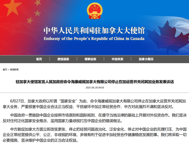 6月27日,加拿大政府以所谓“国家安全”为由,命令海康威视加拿大有限公司停止在加拿大运营并关闭其加拿大业务,严重损害中国企业合法正当权益,干扰破坏中加正常经贸合作,中方对此强烈不满和坚决反对。