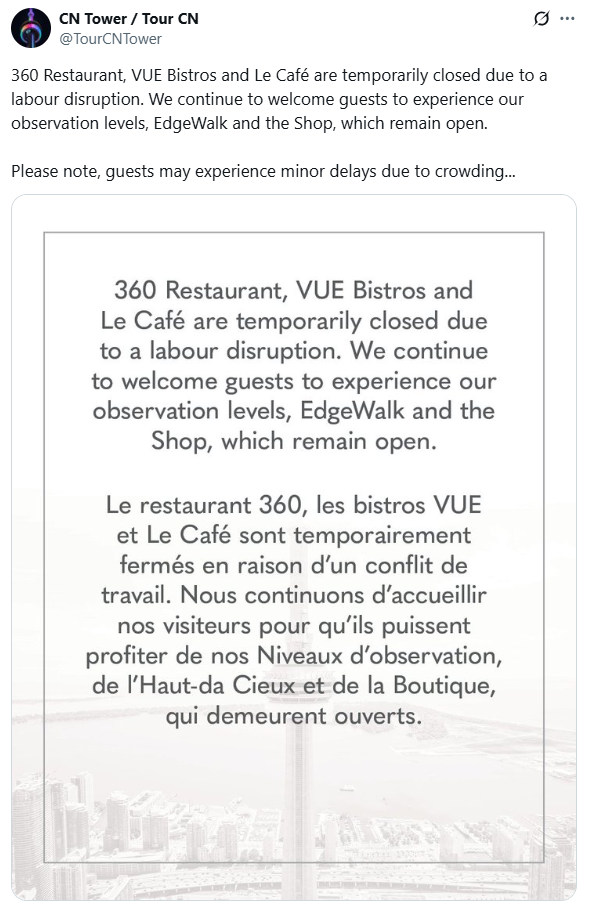 CN塔一名发言人向CP24证实,目前观景层、EdgeWalk高空行走项目和纪念品商店仍照常开放,但因劳资纠纷,360全景餐厅、VUE Bistros餐厅和Le Café咖啡馆均已关闭。