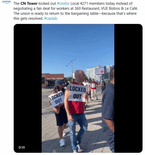 周一(6月30日)早上,代表250名CN塔员工的工会Unifor表示,在加拿大国庆日前夕,这些员工已被负责运营该多伦多地标的国营机构Canada Lands Company锁在公司外(Lockout),即遭雇主强制停工、禁止工作。