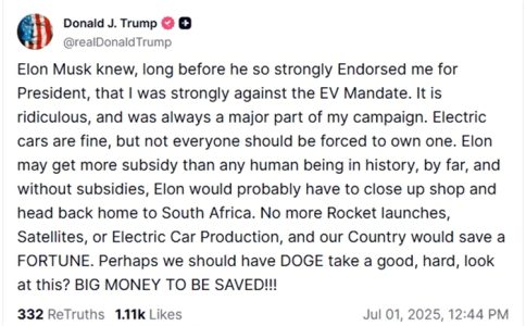 「早在馬斯克強烈支持我競選總統之前,他就知道我強烈反對電動汽車強制令。這簡直荒謬,而且這一直是我競選活動的重要組成部分。電動汽車固然好,但不應該強迫每個人都擁有一輛。埃隆獲得的補貼可能比歷史上任何人都多,如果沒有補貼,埃隆很可能不得不關門大吉,回到南非老家。火箭發射、衛星生產和電動汽車生產都停止了,我們國家就能省下一大筆錢。或許我們應該讓政府效率部(DOGE)好好查查這個問題?這可是省下一大筆錢啊!!!」