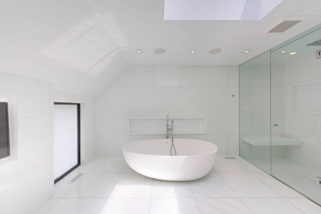 主套房设有带加热超大瓷砖地板的套间、落地石护墙板、天窗、独立更衣室和内置电视柜。