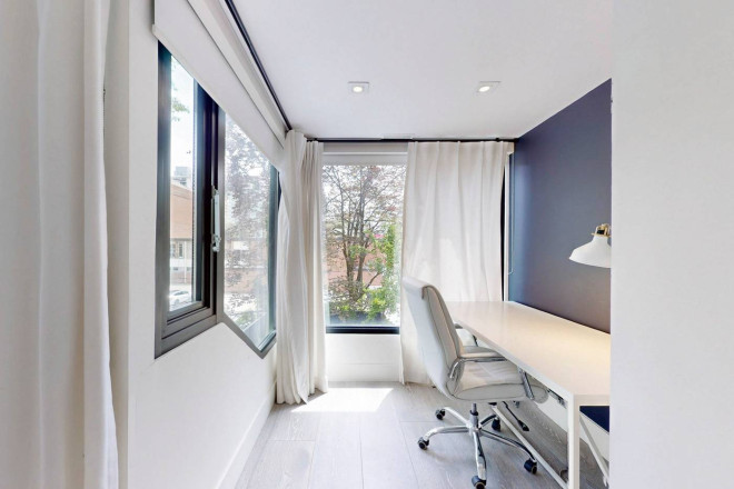 楼上有一个阳光明媚的工作区、一个带镜子的灵活空间、一个时尚的第二间卧室,配有集成学习区和套间。
