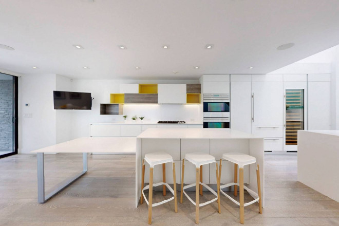 厨房配备顶级电器、定制 Scavolini 橱柜以及带有引人注目的天窗和吊灯的 23 英尺中庭。