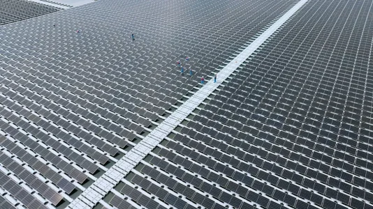 該漂浮式光伏電站所在水域與海域聯通,利用海水表面空間吸收太陽能發電。項目位於青島煉化氫能“產研加”示範園內,具有零排放、效率高、成本低等優勢,占地面積約60000平方米,裝機容量7.5兆瓦。
