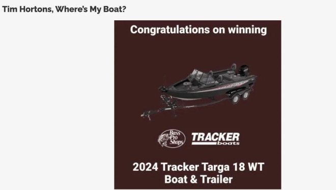 据蒙特利尔律师事务所 LPC Avocats 表示,全加拿大约有50万人在2024年4月收到邮件,被告知赢得了 “Tracker Targa 18 WT 2024” 型钓鱼船和拖车(价值约6.4万加元)。