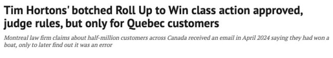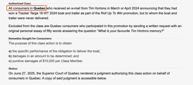 Tim Hortons 发言人回应称,他们早在2024年就已向收到误发邮件的顾客道歉,但因案件仍在法庭阶段,暂不便发表评论。