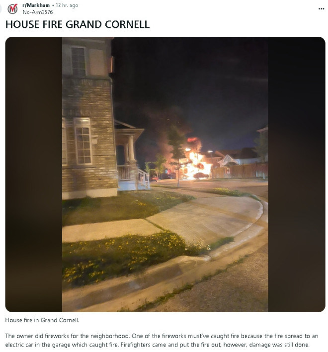 昨晚是加拿大国庆夜,多伦多及周边市镇都有盛大的烟花庆典。然而很多市民更愿意在自家附近放烟花。结果,万锦一处华人区公园起火,另一住宅区更是因烟花引发火情,导致车库起火、电动车被烧毁!