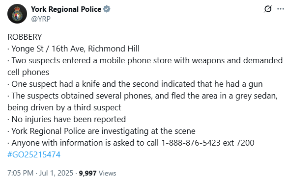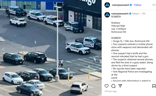 据约克区警方报告和网友描述,7月1日周二下午6点05分,列治文山市位于Yonge St和16th Ave的Hillcrest Mall遭遇2名劫匪“光顾”。1人持刀,另1人自称持枪,洗劫了一家手机店。
