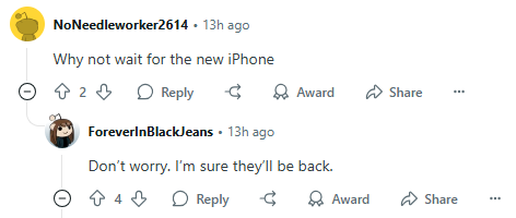 一位网友开玩笑说:“(劫匪)为什么不等等新的iPhone?”下面有人回复说:“别担心,我确定他们还会回来的。”