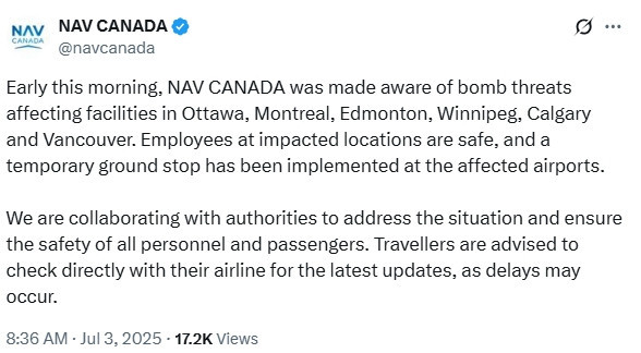 这家航空机构表示:“今天一早,NAV CANADA接到通报,渥太华、蒙特利尔、埃德蒙顿、温尼伯、卡尔加里和温哥华的相关设施受到炸弹威胁影响。”