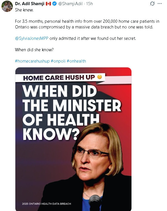 沙姆吉说,安省家庭医疗(Ontario Health atHome)机构和被掩盖的家庭护理问题,说明政府在识别新供应商、监控他们并确保他们在适当监督和保障下提供优质服务方面,是不可信的。”