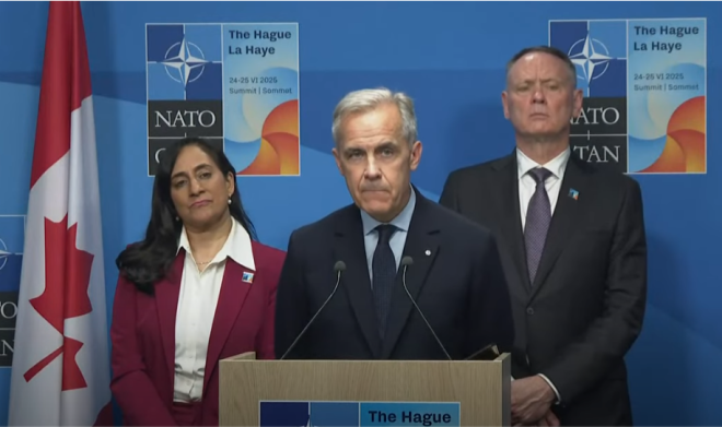 卡尼在6月25日北约峰会宣布,加拿大将大幅提高国防预算,每年最多增加900亿加元,以应对俄罗斯扩张威胁并防止美国总统唐纳德·特朗普退出北约。