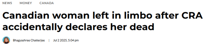 CRA表示,一个人可能会因人为错误、申报失误,或与其他政府部门(如省级记录或社会保险登记处)沟通不畅而被错误地宣布死亡。