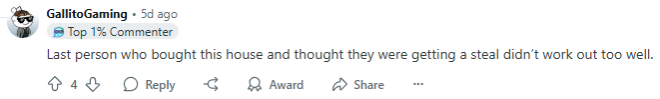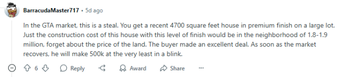 还有认为这简直就是捡漏:“在大多伦多地区,这简直是捡了个大便宜。你买下了一栋4700平方英尺的高档住宅,地块很大。光是建造这栋装修精美的房子,成本就得在180万到190万之间,还不包括地价。对买家来说,这是一笔好买卖。等市场复苏,他眨眼间就能至少赚50万。”
