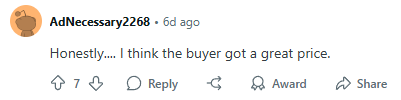 有人认为这个价格不错:”老实说,我认为买家赚了。”