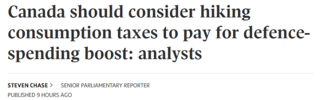 相比之下,加拿大本财年与国防相关的联邦预算约为630亿加元,仅占GDP的2%左右。这一承诺将迫使渥太华采取以下措施之一或组合: