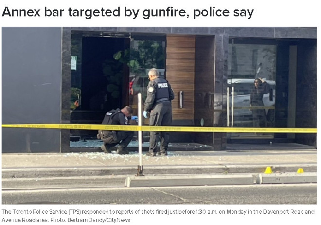 多伦多警方称,本市Annex社区的一家酒吧在深夜遭受损。这是一周内该地址的餐厅第二次遭枪击。