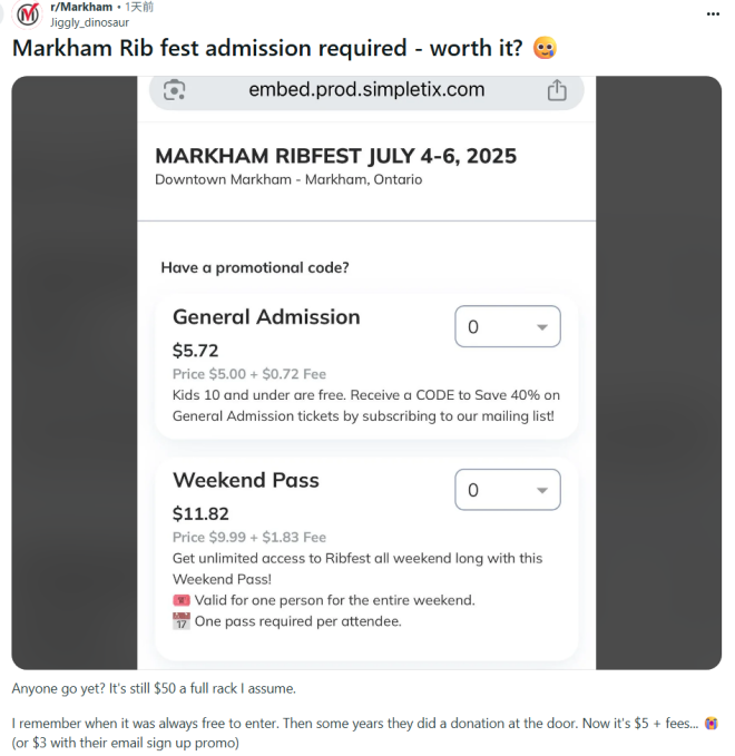 本周末,排骨节(Markham Rib Fest)正如火如荼地举行,但这个以往备受欢迎的今年却被骂惨了。原因是,今年竟然要收门票了。