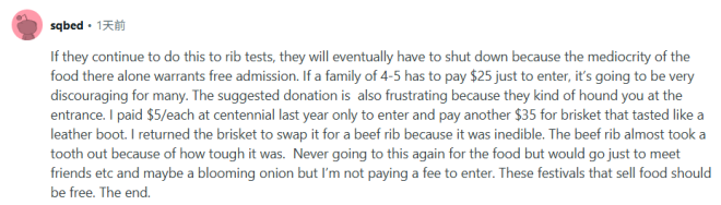 “如果他们继续这样搞,排骨节最终只会走向关门,因为那里的食物实在太普通了,根本配不上收门票。如果一个四五口之家光是进场就要花$25,对很多人来说都太劝退了。所谓‘建议捐款’也很烦人,因为他们在门口几乎是强行要求你捐。我去年在Centennial花了$5门票,又花了$35买了一份像皮靴一样的牛腩。我把它退回去换了牛肋排,因为那玩意根本咬不动。牛肋排也硬得差点把我的牙都磕掉。我再也不会为了吃东西去参加这种节日了,顶多就是去和朋友见见面、吃个洋葱圈。但让我再为入场付钱?没门!这种卖吃的节日,本来就应该免费入场。说完了。”