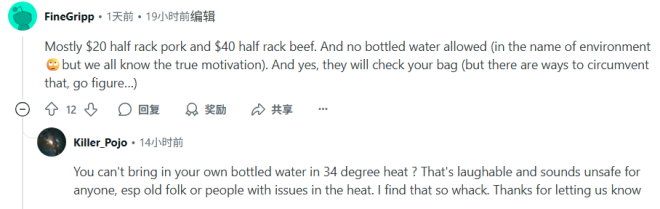 “猪肋排半条差不多$20,牛肋排半条$40。而且不允许带瓶装水(打着环保的旗号,但懂得都懂)。他们会检查你的包(但也有办法绕过,自己想办法吧……)”
