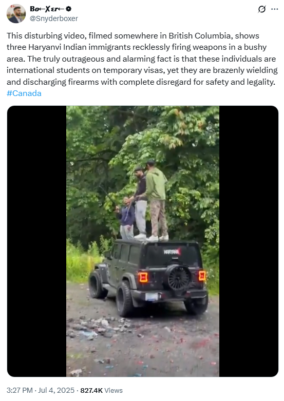 曝光该视频的网友发文称:“这段令人震惊的视频拍摄于BC省某地,画面中三名来自哈里亚纳邦的移民在林地中肆意开枪。更令人愤怒和担忧的是,这几人竟是持临时签证的国际学生,却公然持枪并随意射击,完全无视安全与法律。”